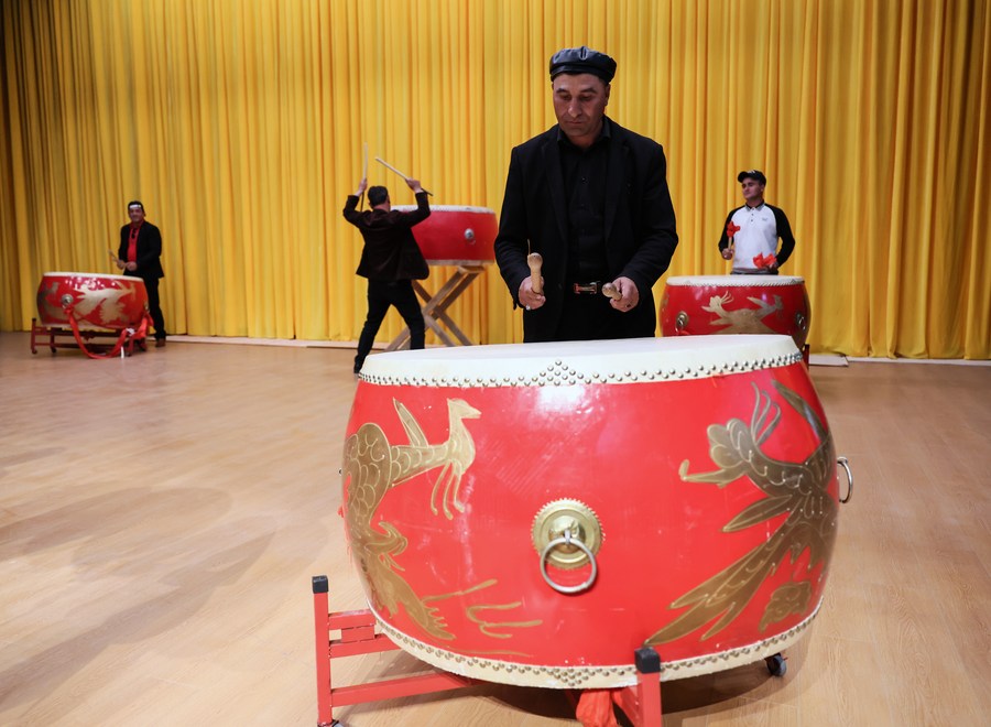 An artist of a local art troupe beats a drum during a rehearsal in Taxkorgan Tajik Autonomous County, northwest China's Xinjiang Uygur Autonomous Region, Sept. 4, 2023. (Xinhua/Lan Hongguang)