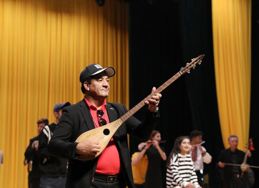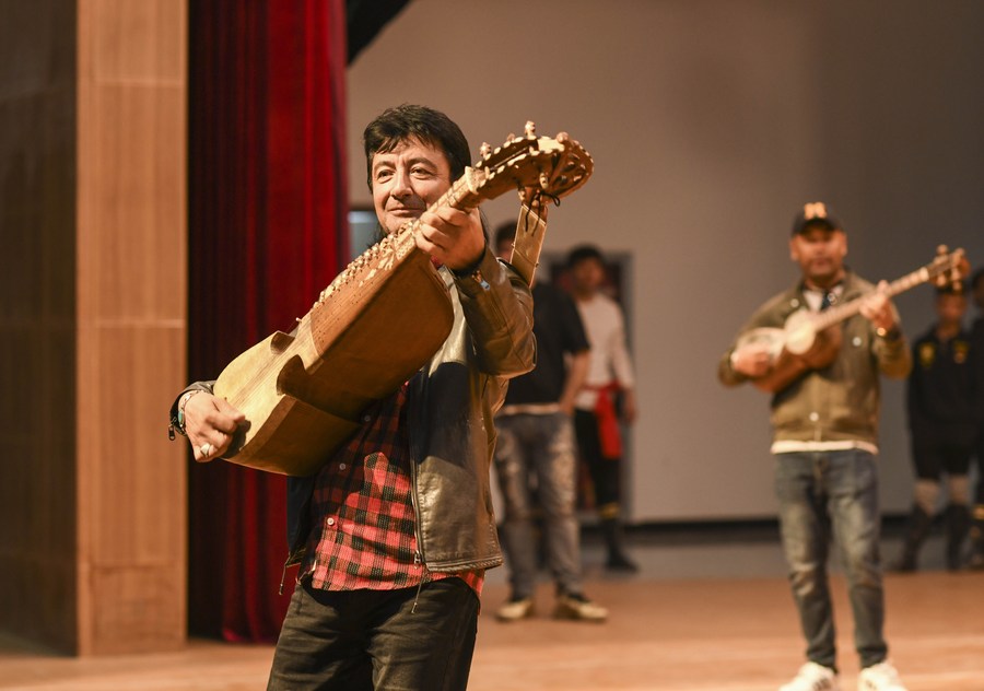 An artist of a local art troupe plays the traditional instrument during a rehearsal in Taxkorgan Tajik Autonomous County, northwest China's Xinjiang Uygur Autonomous Region, Sept. 7, 2023. (Xinhua/Hu Huhu)