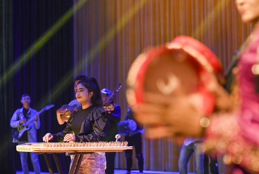 Artists of a local art troupe rehearse a program for a music festival in Taxkorgan Tajik Autonomous County, northwest China's Xinjiang Uygur Autonomous Region, Sept. 4, 2023. (Xinhua/Lan Hongguang)