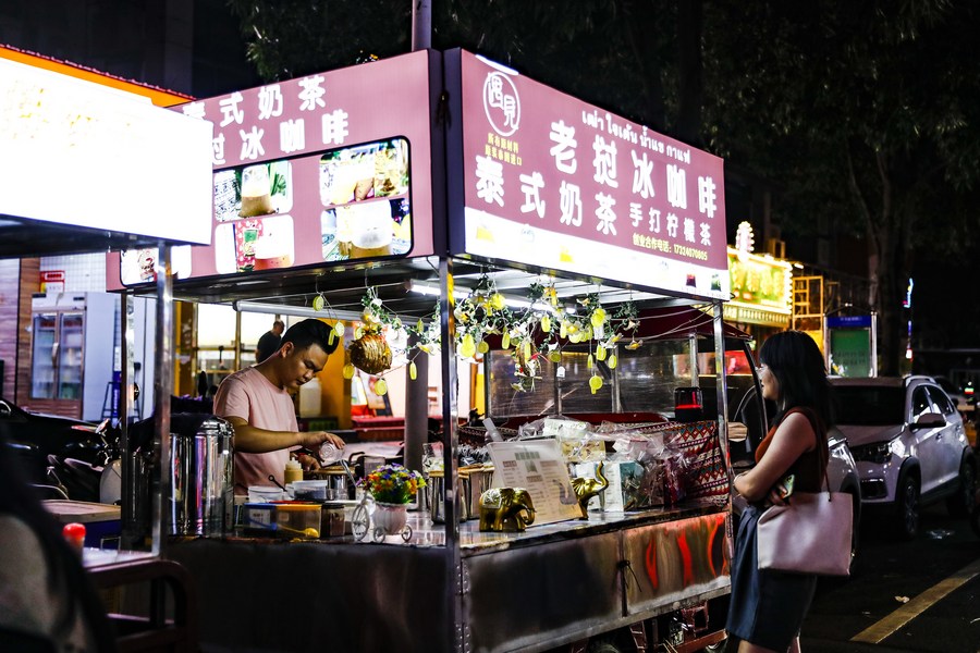A customer visits a night market stall selling Southeast Asian beverages in Nanning, south China's Guangxi Zhuang Autonomous Region, Sept. 8, 2023. (Xinhua/Hu Xingyu)