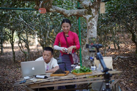 Xian Jin (right) prepares for a livestream at a tea garden in Jingmai Mountain, Lancang Lahu autonomous county, Pu'er city of southwest China's Yunnan Province. (Photo courtesy of the interviewee)