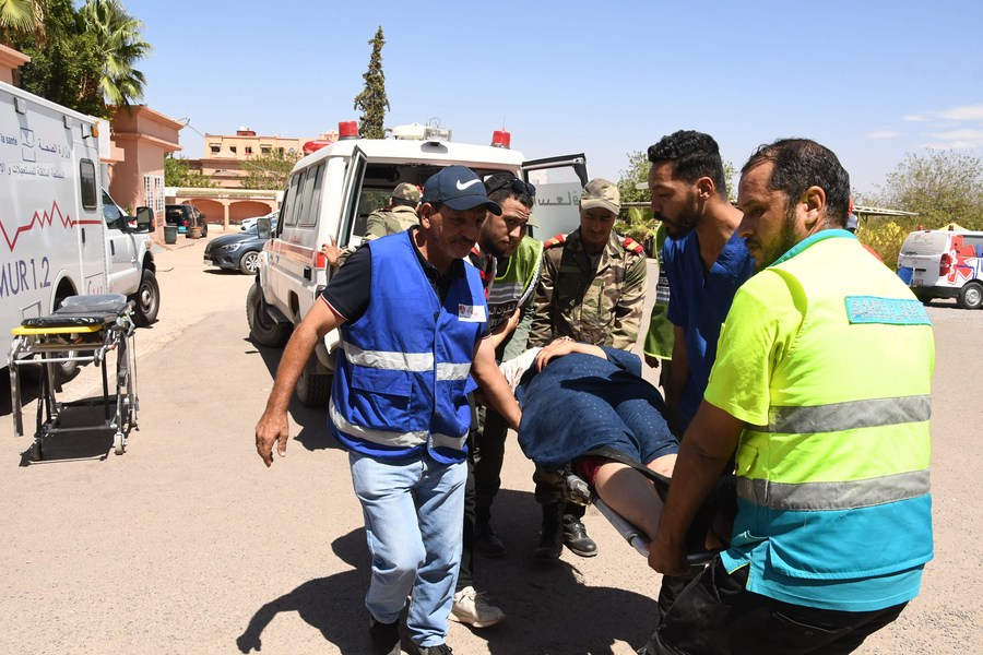 Rescuers transfer an injured near the epicenter of a massive earthquake in Azrou, Morocco, on Sept. 10, 2023. (Photo by Saouri Aissa/Xinhua)