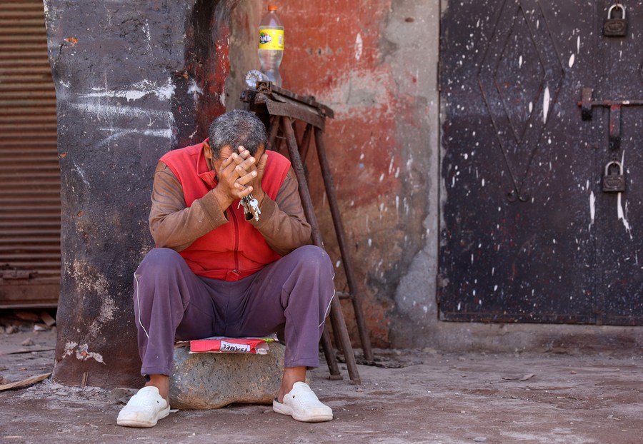 A man grieves in front of his house near the epicenter of an earthquake in Amizmiz, Morocco, Sept. 10, 2023. (Xinhua/Huo Jing)