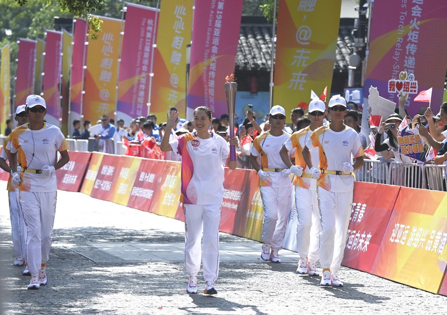The fourth leg of the Hangzhou Asian Games torch relay featured historical attractions and modern landmarks of Shaoxing in Zhejiang Province.