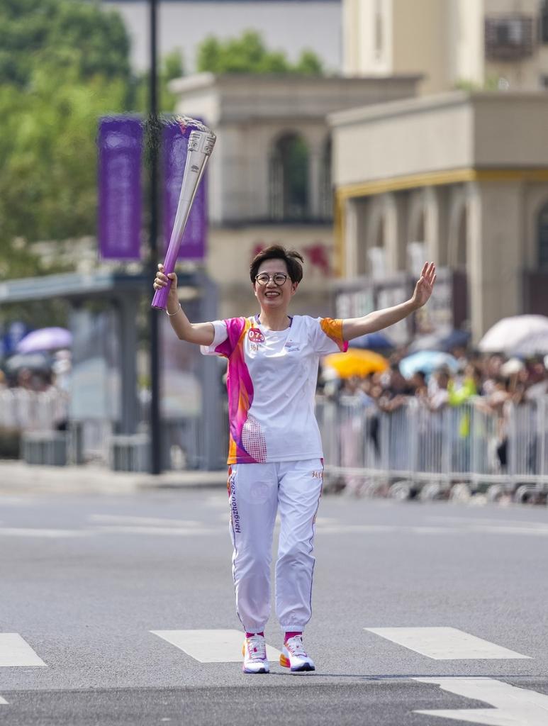 Torch bearer Tu Hongyan runs the torch relay of the 19th Asian Games in Shaoxing, east China's Zhejiang Province, Sept. 11, 2023. (Xinhua/Sun Fei)