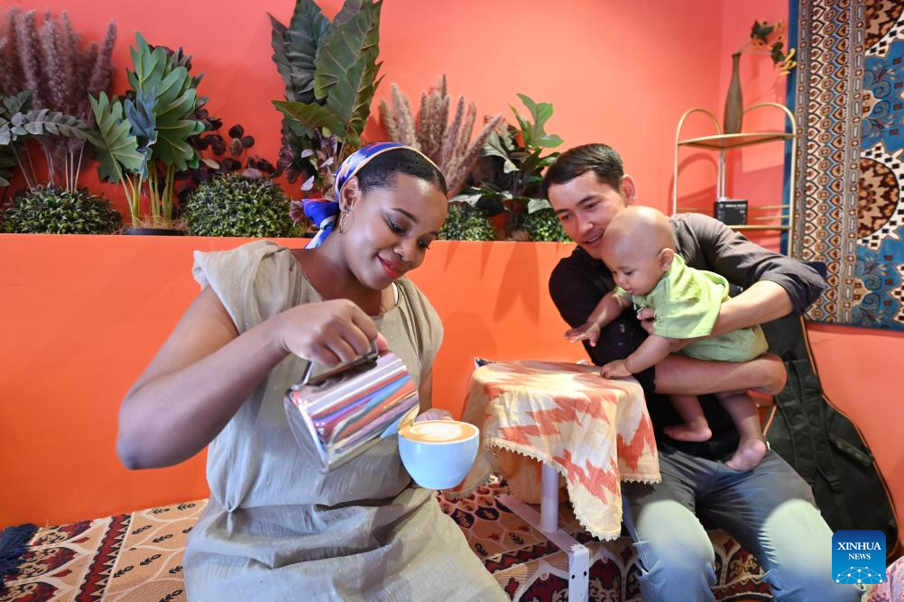 Hadiya Msham Abdulla makes coffee as her husband Dilxat Tursun holding their baby sits next to her at the Dili and Diya Cafe at the ancient city of Kashgar scenic area in Kashgar, northwest China's Xinjiang Uygur Autonomous Region, Sept. 7, 2023. (Xinhua/Li Xiang)