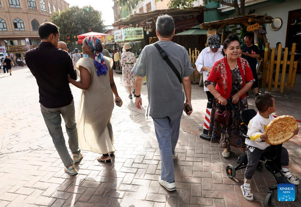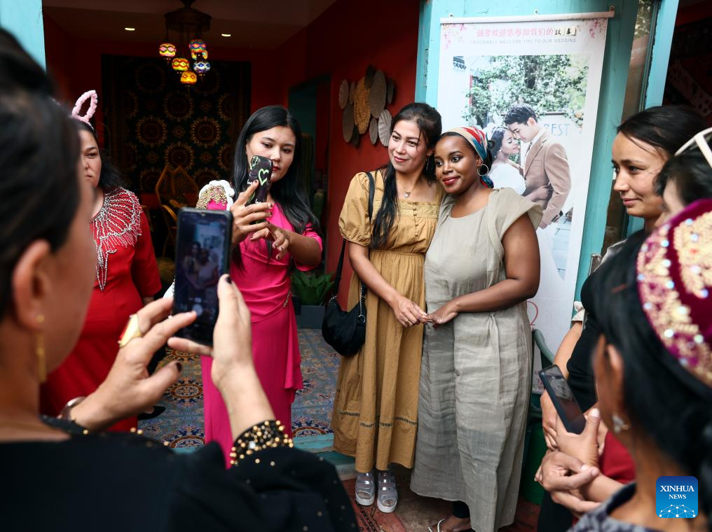 Tourists pose with Hadiya Msham Abdulla in front of the Dili and Diya Cafe at the ancient city of Kashgar scenic area in Kashgar, northwest China's Xinjiang Uygur Autonomous Region, Sept. 7, 2023. (Xinhua/Lan Hongguang)