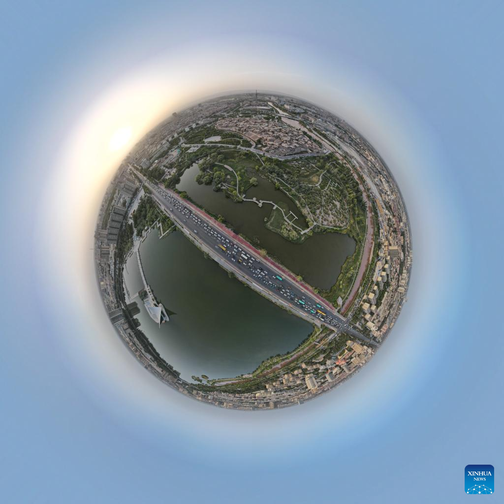 This aerial panoramic photo taken on Sept. 7, 2023 shows the view of Kashgar in northwest China's Xinjiang Uygur Autonomous Region. (Xinhua/Jin Haoyuan)