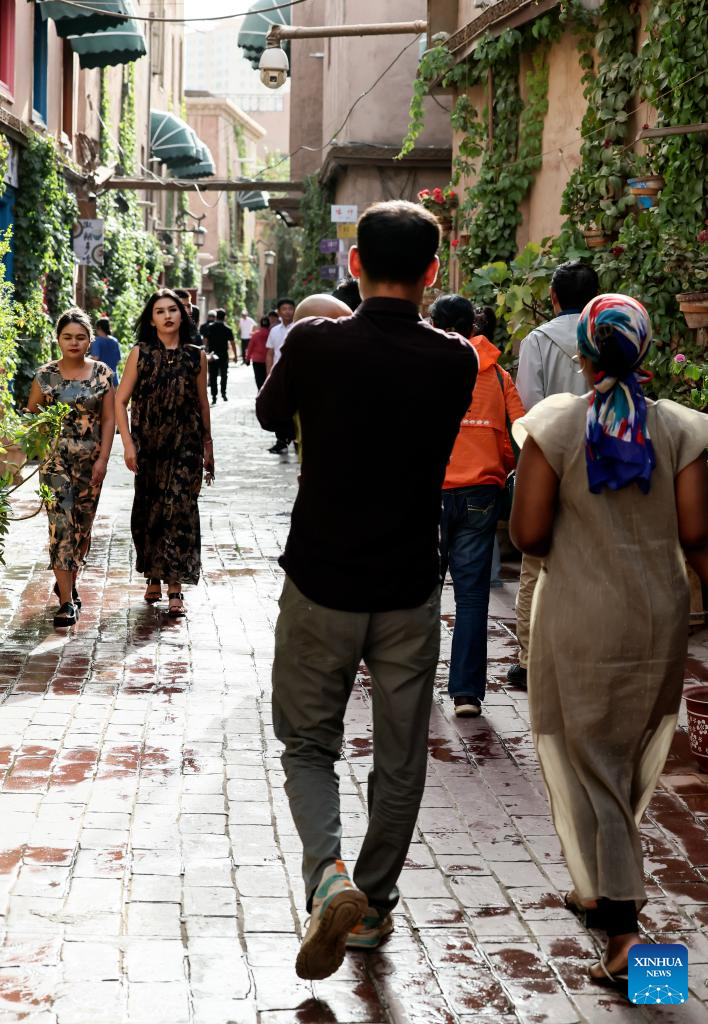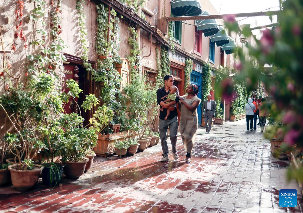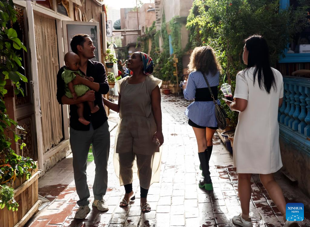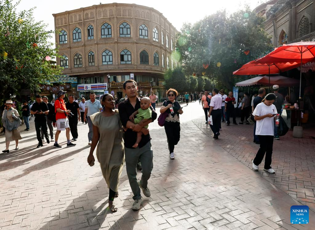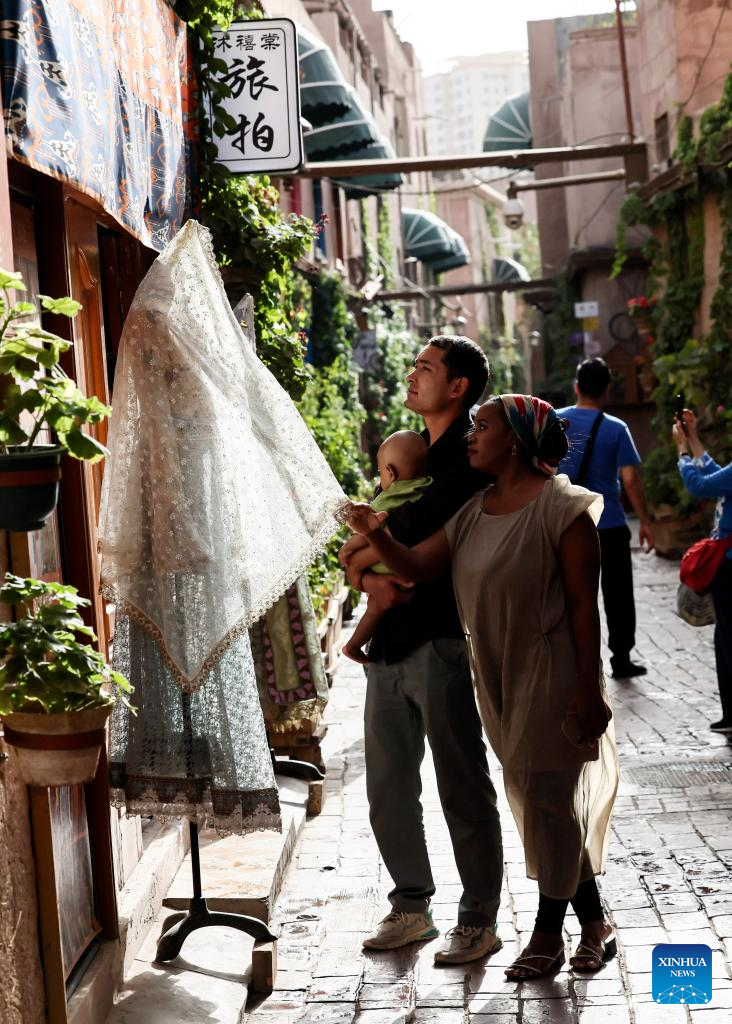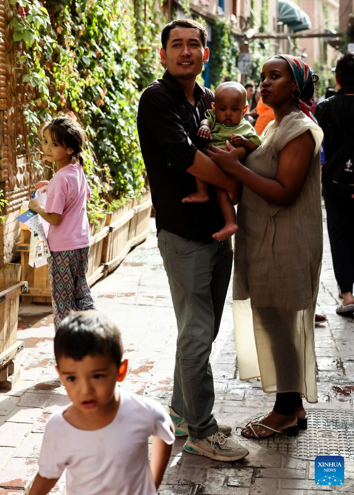 Dilxat Tursun (R, front) and his wife Hadiya Msham Abdulla walk at an alley with their baby at the ancient city of Kashgar scenic area in Kashgar, northwest China's Xinjiang Uygur Autonomous Region, Sept. 7, 2023. (Xinhua/Lan Hongguang)
