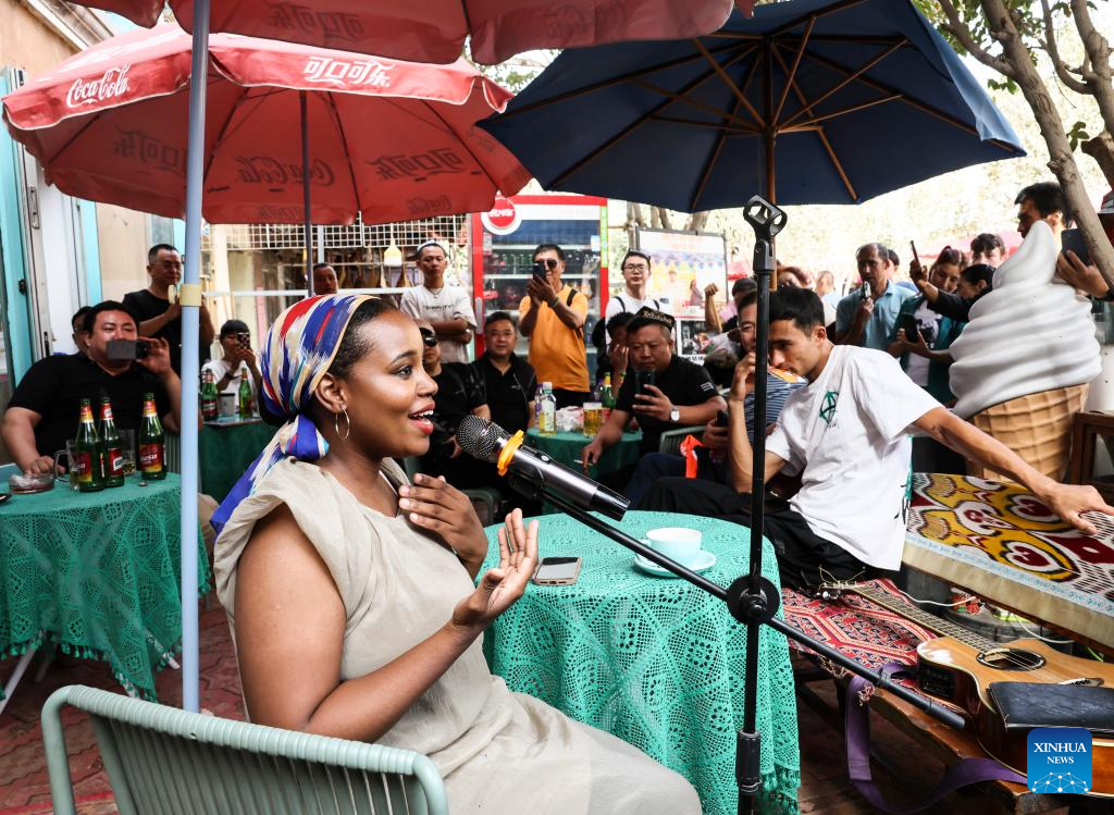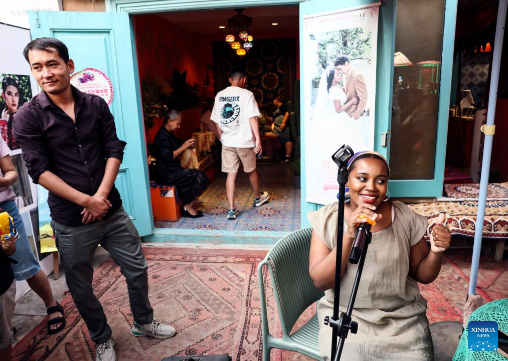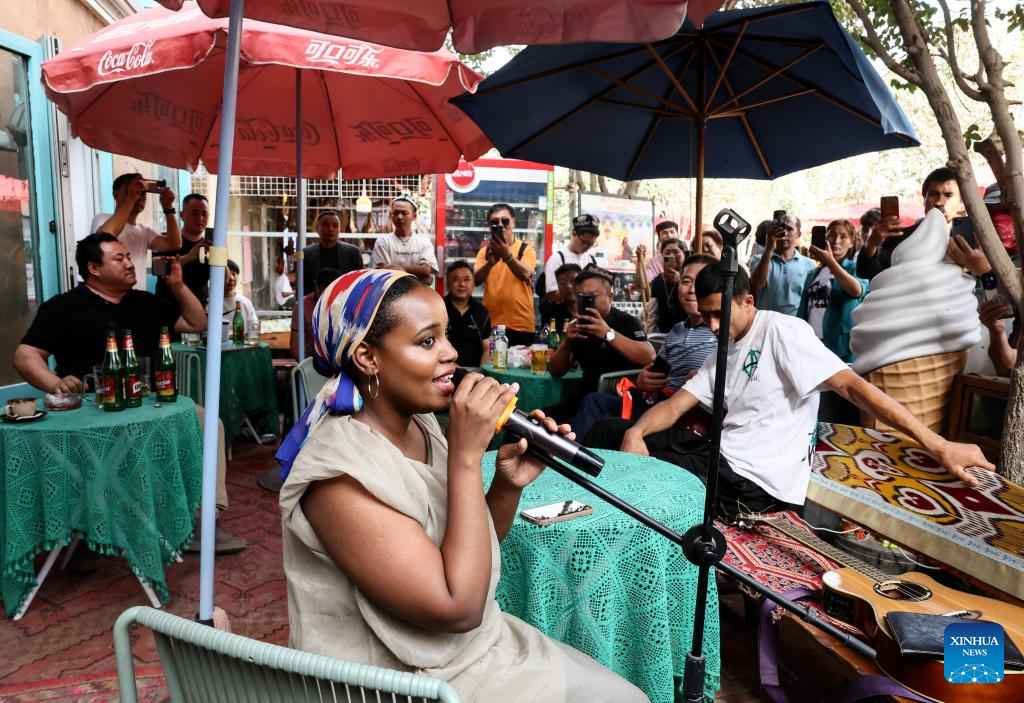 Hadiya Msham Abdulla sings in front of the Dili and Diya Cafe at the ancient city of Kashgar scenic area in Kashgar, northwest China's Xinjiang Uygur Autonomous Region, Sept. 7, 2023. (Xinhua/Jin Haoyuan)