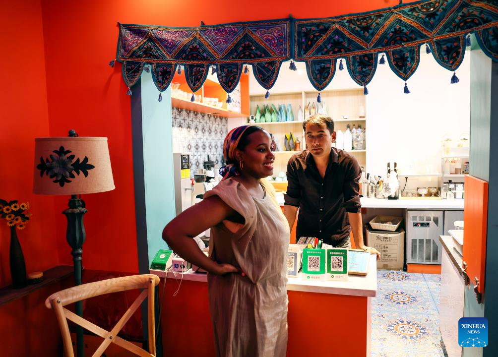 Dilxat Tursun (R) and his wife Hadiya Msham Abdulla chat with customers at the Dili and Diya Cafe at the ancient city of Kashgar scenic area in Kashgar, northwest China's Xinjiang Uygur Autonomous Region, Sept. 7, 2023. (Xinhua/Lan Hongguang)