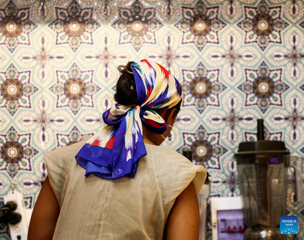 Hadiya Msham Abdulla waits for customers as her husband Dilxat Tursun sees her at the Dili and Diya Cafe at the ancient city of Kashgar scenic area in Kashgar, northwest China's Xinjiang Uygur Autonomous Region, Sept. 7, 2023. (Xinhua/Lan Hongguang)