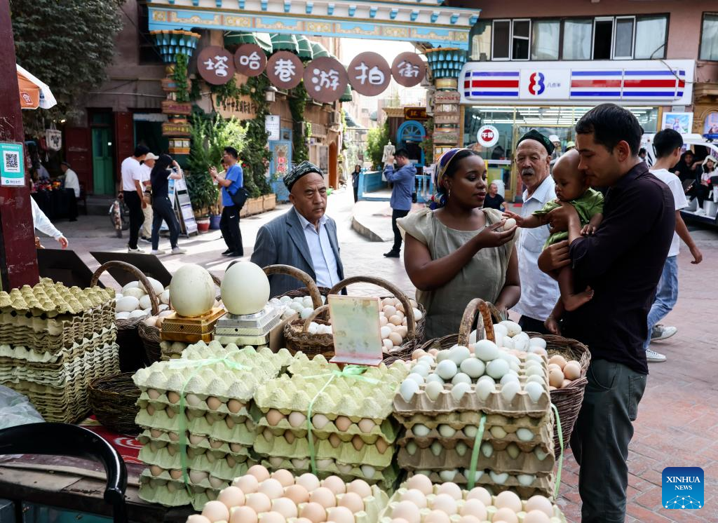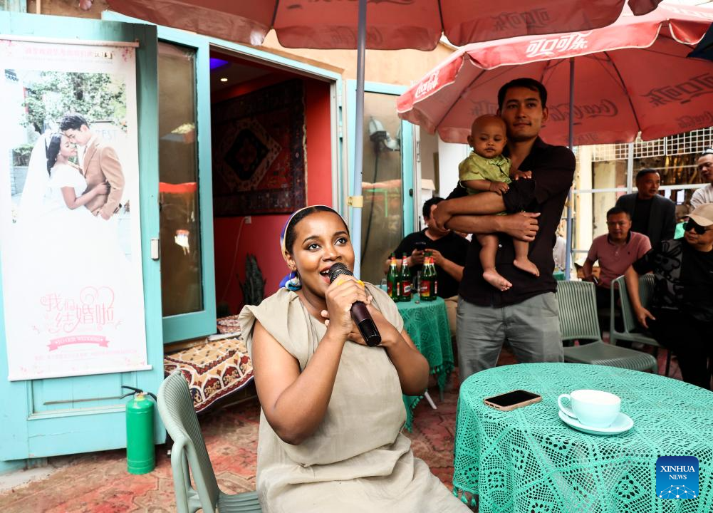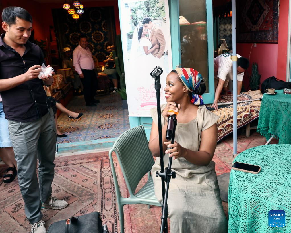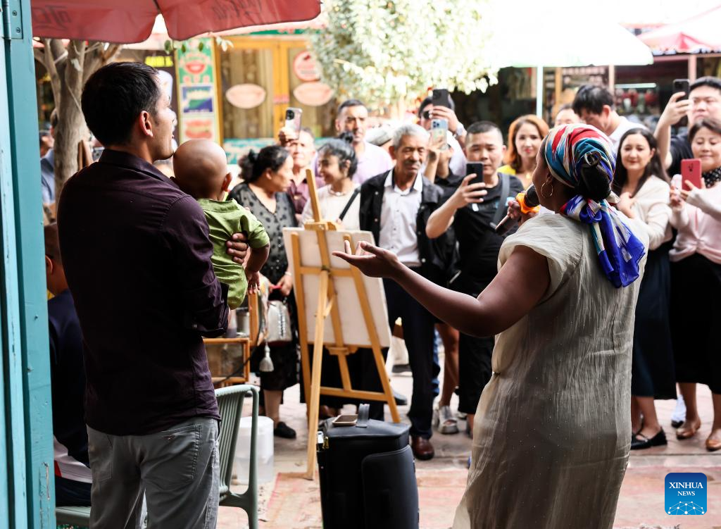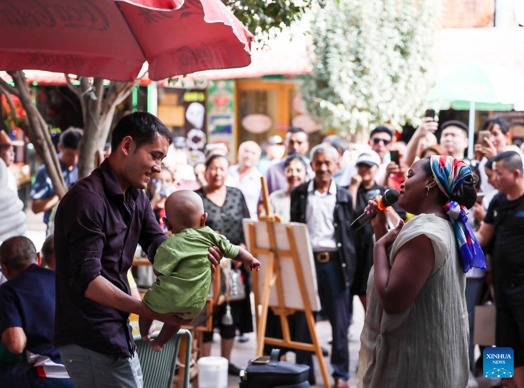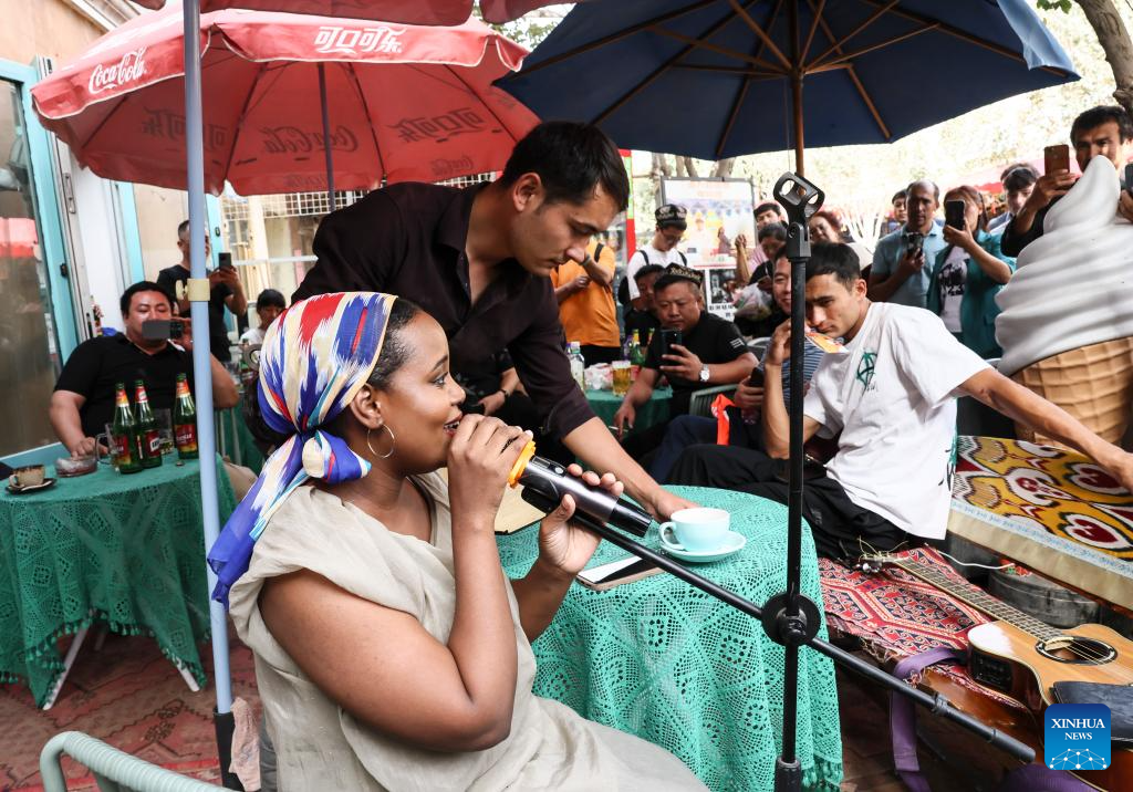 Hadiya Msham Abdulla sings in front of the Dili and Diya Cafe as her husband Dilxat Tursun serves her with a cup of coffee at the ancient city of Kashgar scenic area in Kashgar, northwest China's Xinjiang Uygur Autonomous Region, Sept. 7, 2023. (Xinhua/Lan Hongguang)