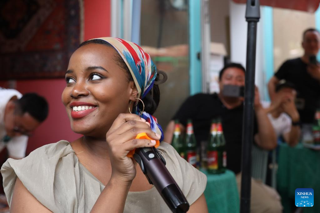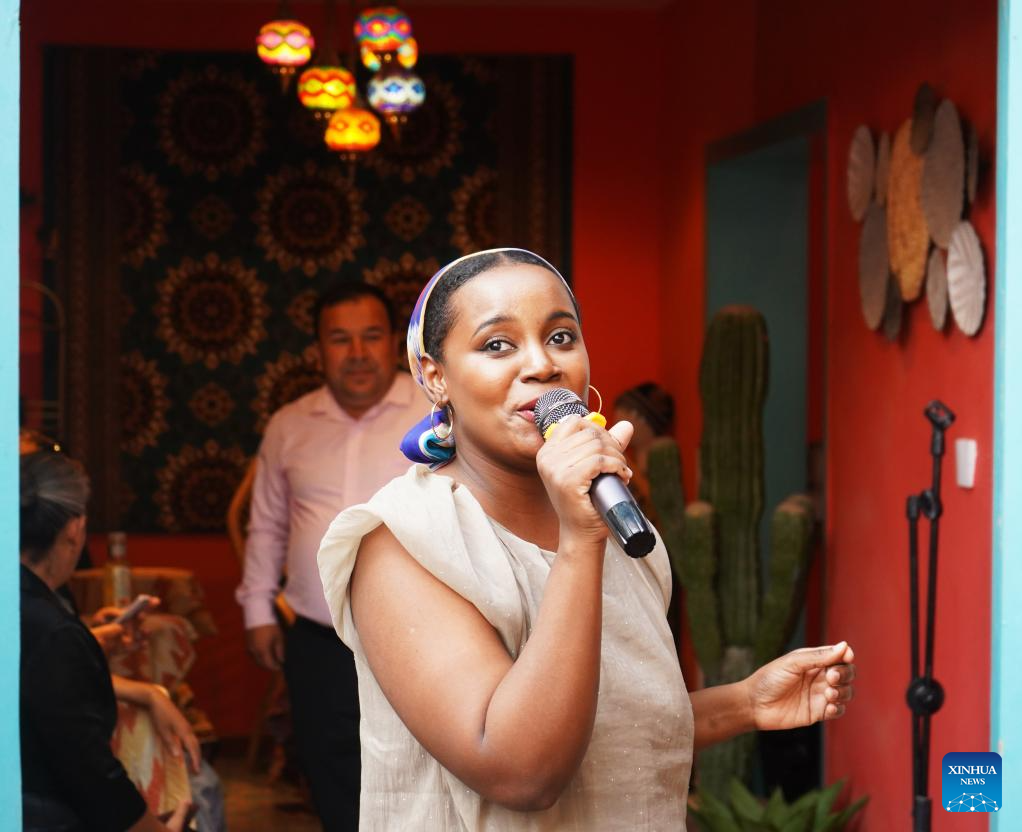 Hadiya Msham Abdulla sings in front of the Dili and Diya Cafe at the ancient city of Kashgar scenic area in Kashgar, northwest China's Xinjiang Uygur Autonomous Region, Sept. 7, 2023. (Xinhua/Cheng Tingting)