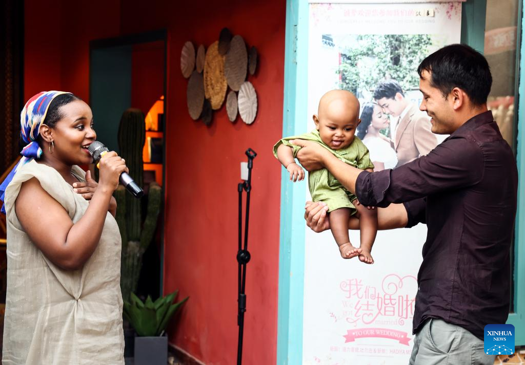 Hadiya Msham Abdulla (L) sings as her husband Dilxat Tursun holding their baby interacts with her in front of the Dili and Diya Cafe at the ancient city of Kashgar scenic area in Kashgar, northwest China's Xinjiang Uygur Autonomous Region, Sept. 7, 2023. (Xinhua/Lan Hongguang)