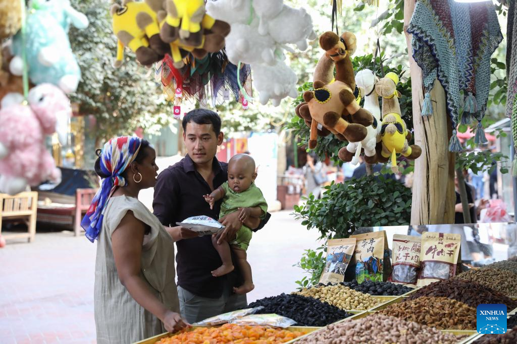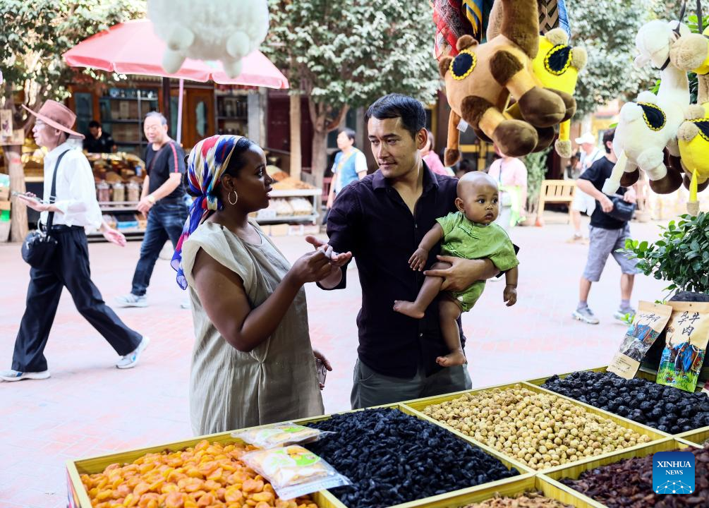 Dilxat Tursun and his wife Hadiya Msham Abdulla are seen with their baby at a booth at the ancient city of Kashgar scenic area in Kashgar, northwest China's Xinjiang Uygur Autonomous Region, Sept. 7, 2023. (Xinhua/Cheng Tingting)