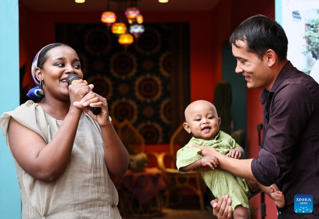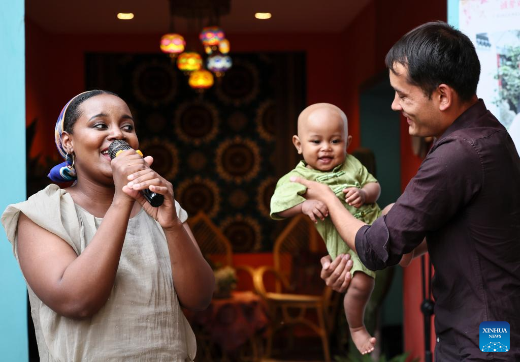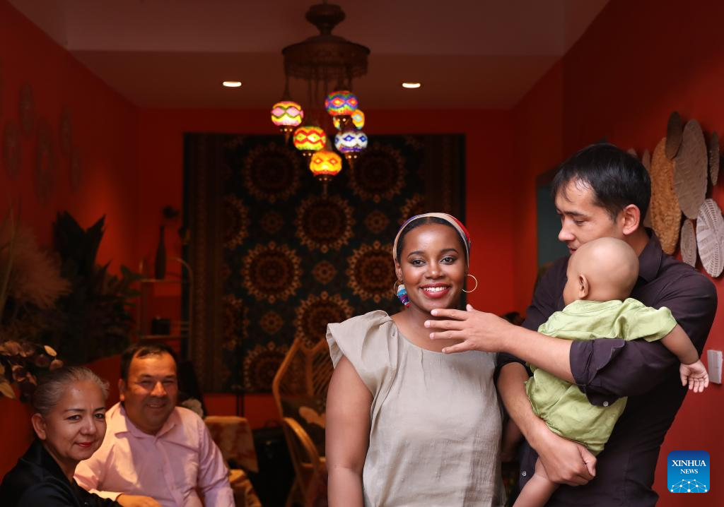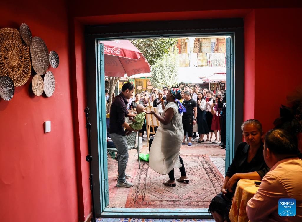 Hadiya Msham Abdulla (C) sings as her husband Dilxat Tursun holding their baby interacts with her in front of the Dili and Diya Cafe at the ancient city of Kashgar scenic area in Kashgar, northwest China's Xinjiang Uygur Autonomous Region, Sept. 7, 2023. (Xinhua/Lan Hongguang)