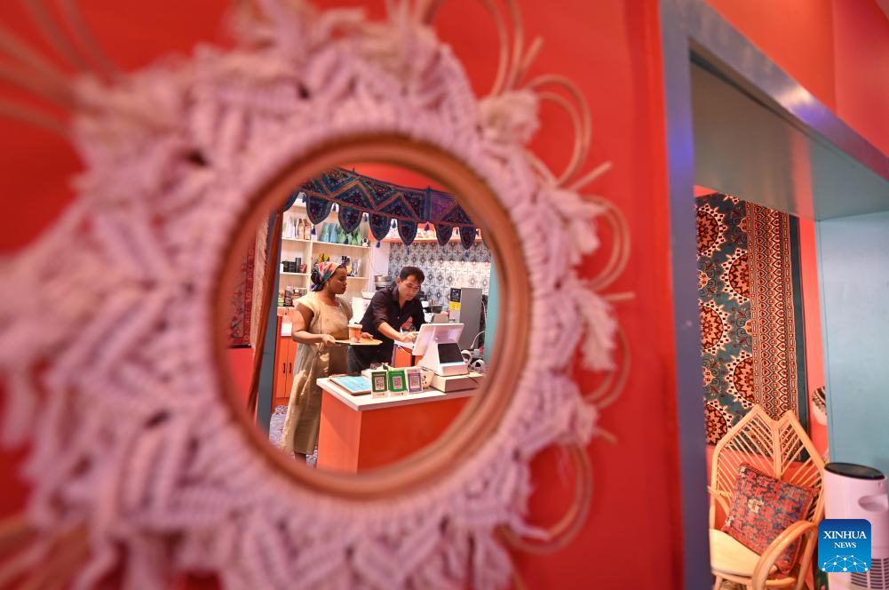 Dilxat Tursun (L) and his wife Hadiya Msham Abdulla make coffee at the Dili and Diya Cafe at the ancient city of Kashgar scenic area in Kashgar, northwest China's Xinjiang Uygur Autonomous Region, Sept. 7, 2023. (Xinhua/Cheng Tingting)