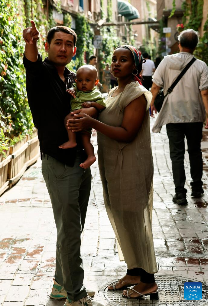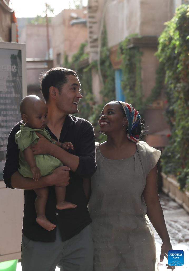 Dilxat Tursun (L) and his wife Hadiya Msham Abdulla walk at an alley with their baby at the ancient city of Kashgar scenic area in Kashgar, northwest China's Xinjiang Uygur Autonomous Region, Sept. 7, 2023. (Xinhua/Lan Hongguang)