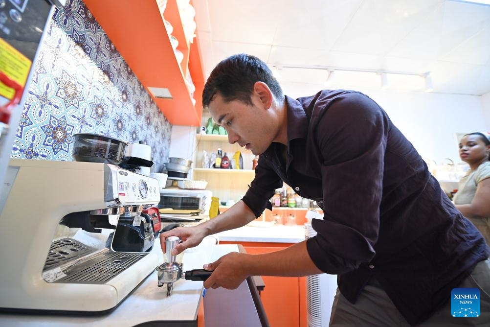 Hadiya Msham Abdulla makes coffee at the Dili and Diya Cafe at the ancient city of Kashgar scenic area in Kashgar, northwest China's Xinjiang Uygur Autonomous Region, Sept. 7, 2023. (Xinhua/Lan Hongguang)