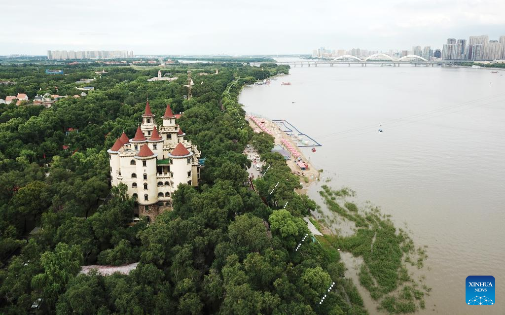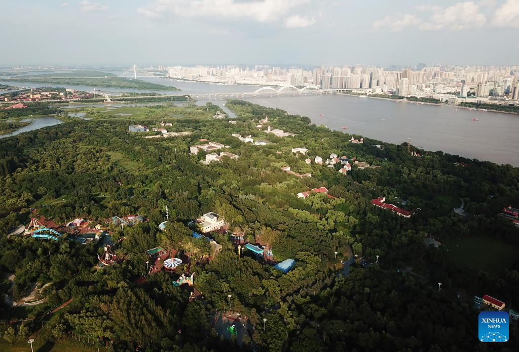 This aerial photo taken on July 31, 2023 shows a view of Sun Island scenic spot in Harbin, northeast China's Heilongjiang Province. Situated on the northern bank of the Songhua River in Harbin City, Sun Island scenic spot offers a multifunctional landscape that combines European-style architecture, rural scenery, folk culture, and ice and snow culture. (Xinhua/Zhang Tao)