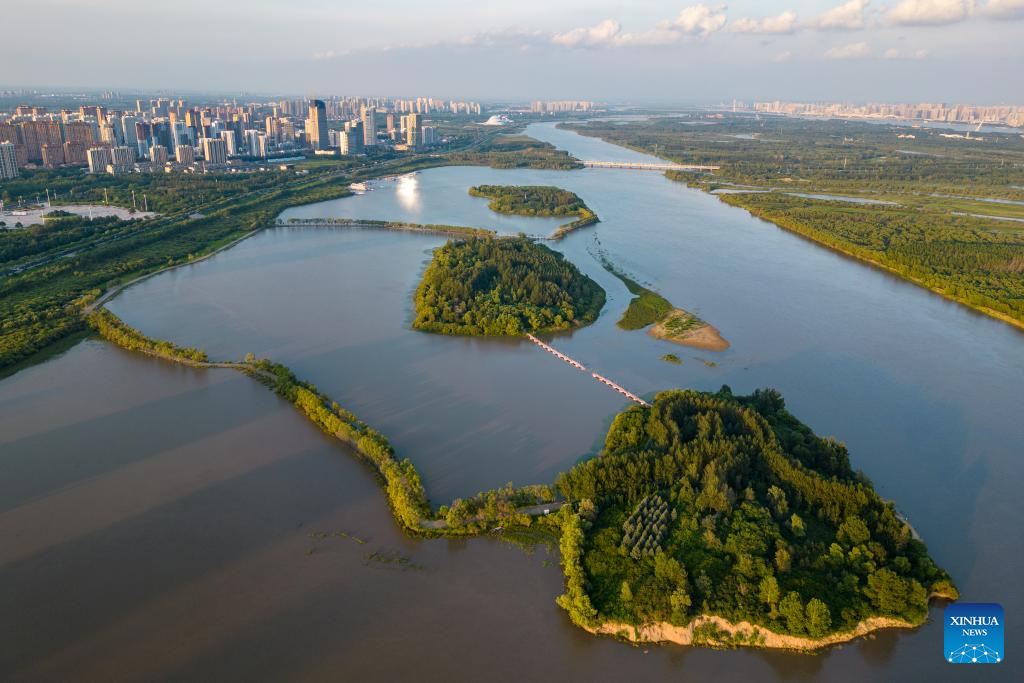 This aerial photo taken on July 31, 2023 shows a view of Sun Island scenic spot in Harbin, northeast China's Heilongjiang Province. Situated on the northern bank of the Songhua River in Harbin City, Sun Island scenic spot offers a multifunctional landscape that combines European-style architecture, rural scenery, folk culture, and ice and snow culture. (Xinhua/Wang Jianwei)