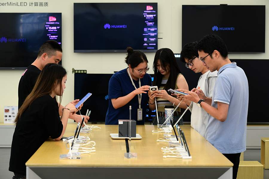 Shoppers try out Huawei's Mate 60 Pro smartphones at a store in Jinhua, Zhejiang province. SHI BUFA/FOR CHINA DAILY
