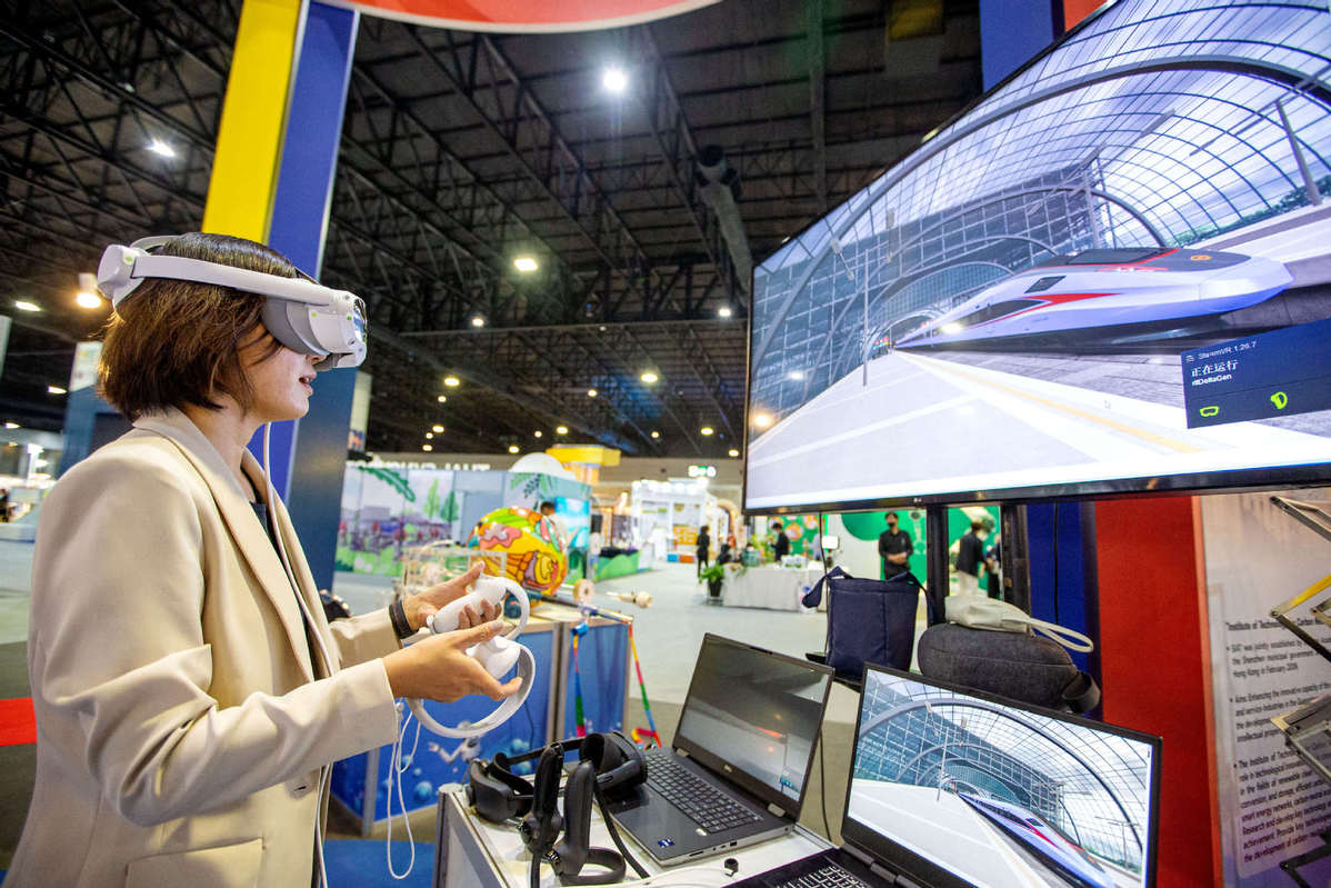 A visitor interacts with a VR system at the China Pavilion during the Thailand National Science and Technology Fair 2023 in Bangkok, Thailand, on Aug 11. [Photo/Xinhua]