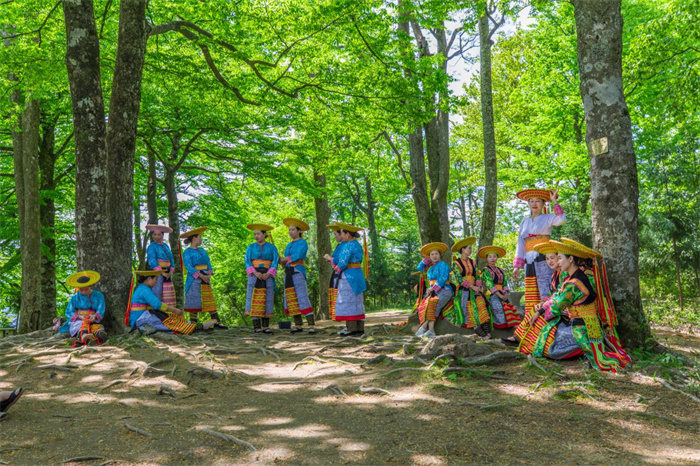 Young women of Huayao, a branch of the Yao ethnic group, rest in an ancient forest in Chongmudang village, Longhui county, central China's Hunan Province. (Photo courtesy of Hunan Xuefeng Mountain Ecological Culture Tourism Co., Ltd.)