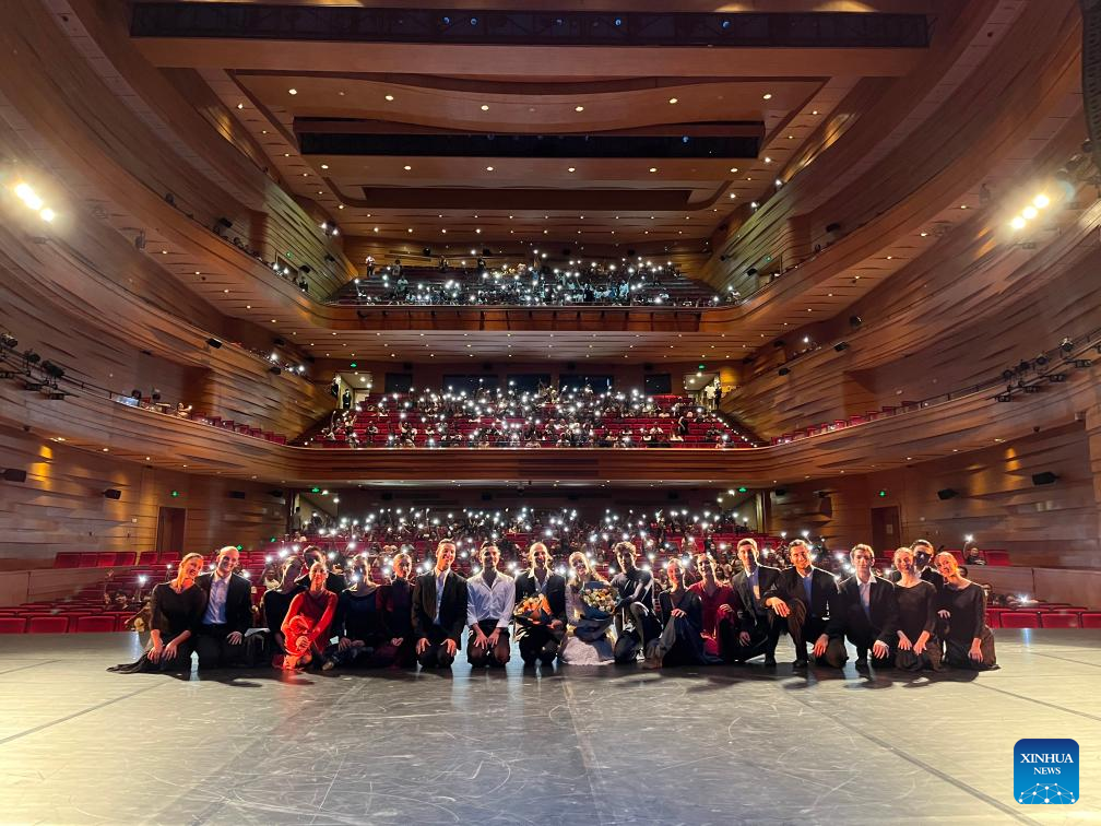 Artists of the Rome Ballet Company pose for a photo on the stage in Shenzhen, south China's Guangdong Province, Sept. 8, 2023. (Xinhua)