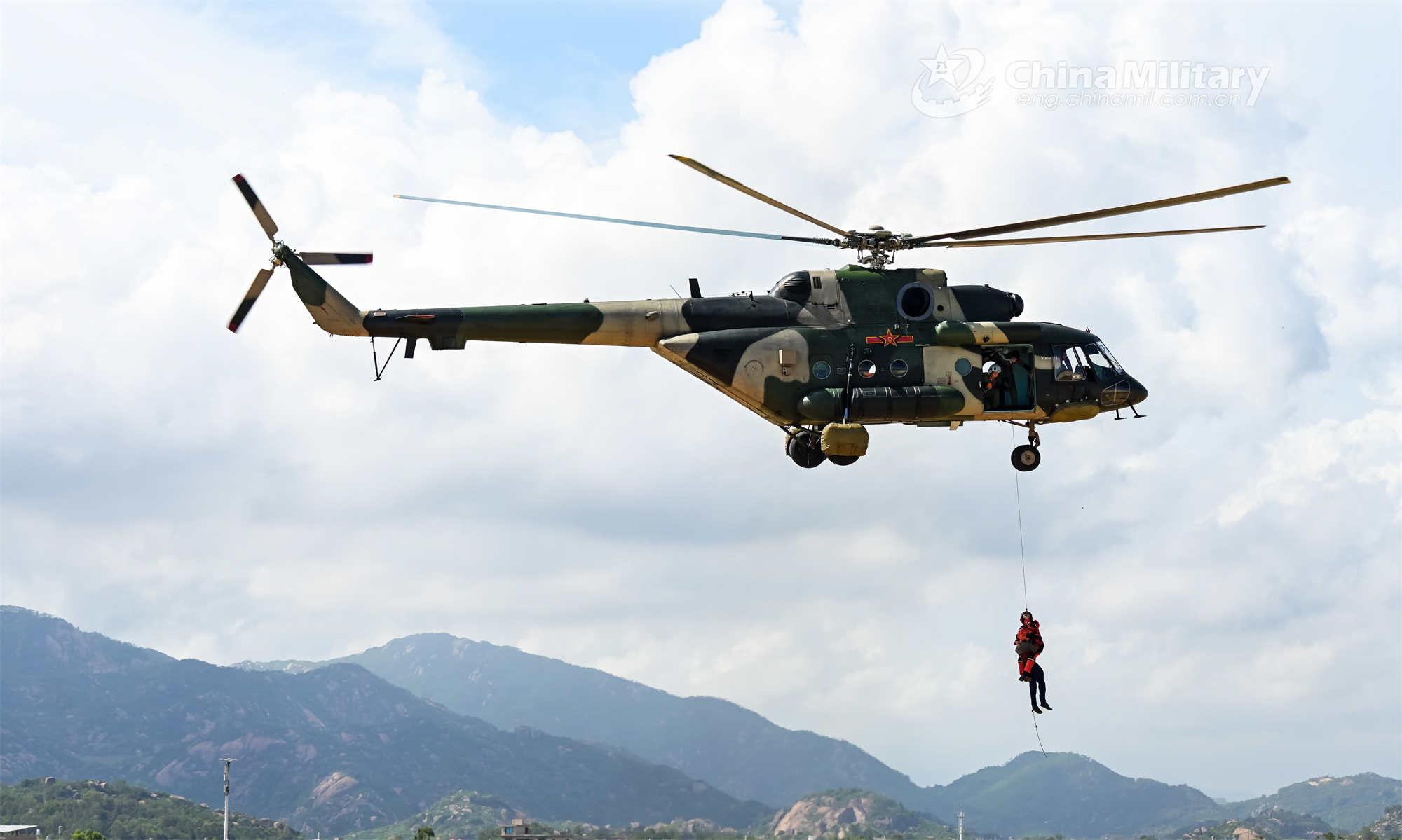 Two rescue men hoist from a Mi-171 transport helicopter during a search and rescue operation in a real-combat flight training exercise on August 31, 2023. (eng.chinamil.com.cn/Photo by Li Shilong)