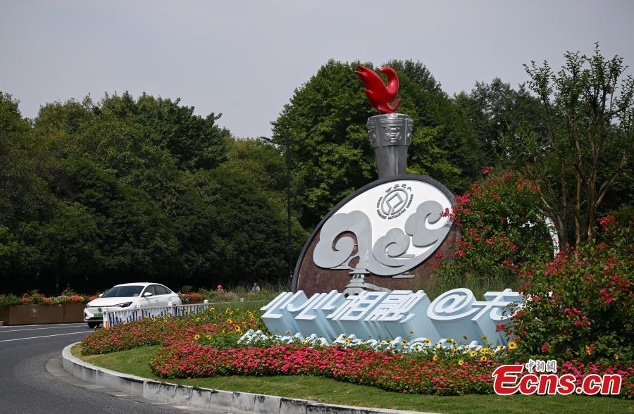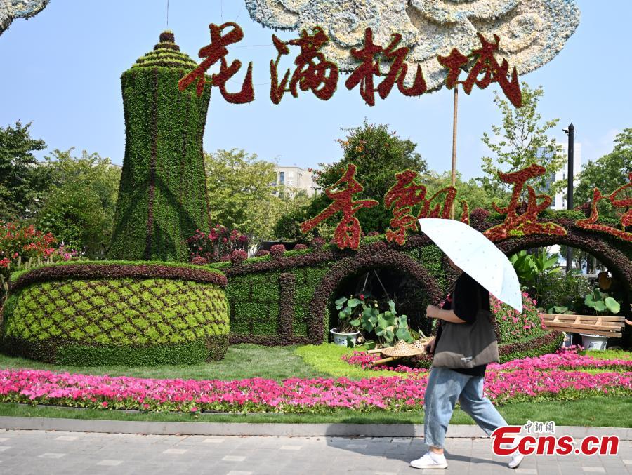 The 19th Asian Games themed flower decorations attract visitors in Hangzhou, east China's Zhejiang Province, Sept. 11, 2023. (Photo: China News Service/Wang Gang)