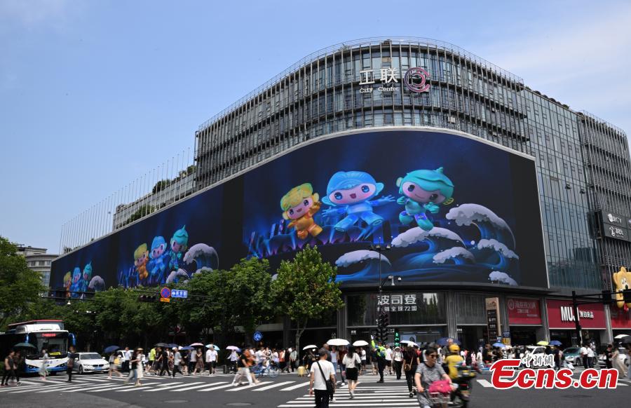 A giant LED screen displays mascots of the 19th Asian Games in downtown Hangzhou, east China's Zhejiang Province, Sept. 11, 2023. (Photo: China News Service/Wang Gang)