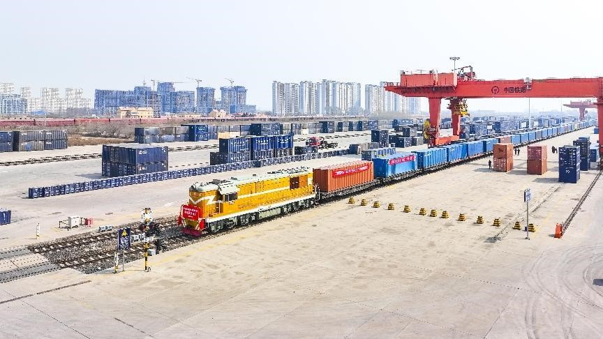 A freight train carrying 165 vehicles in 55 containers departs from Harbin, northeast China's Heilongjiang province, April 16, 2023. The train is expected to reach Europe via Manzhouli, China's largest land port. (People's Daily Online/Yuan Yong)