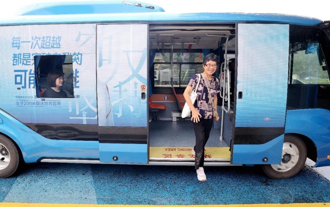 A passenger gets off an autopilot bus in Deqing county, Huzhou, east China's Zhejiang province. (People's Daily Online/Xie Shangguo)