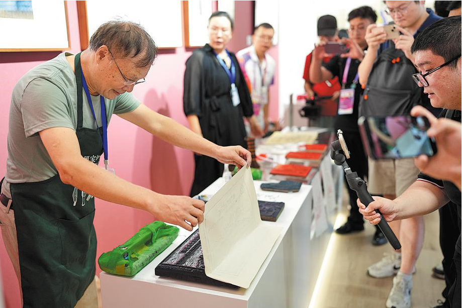 A technician demonstrates a printing method using an engraved block at the Asian Games Village in Hangzhou, Zhejiang province, on Tuesday. Weng Xinyang / Xinhua