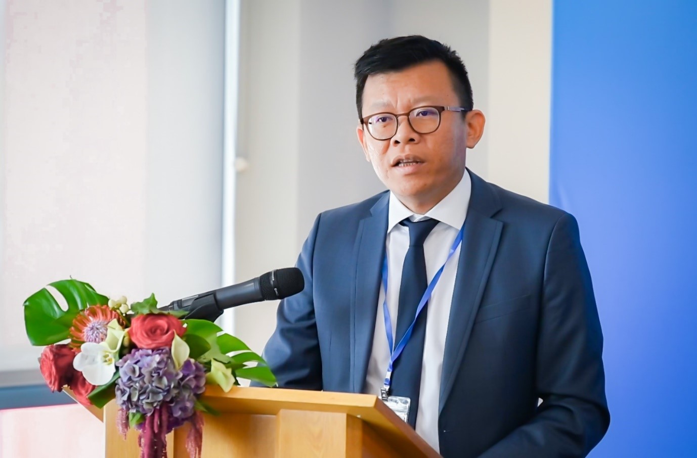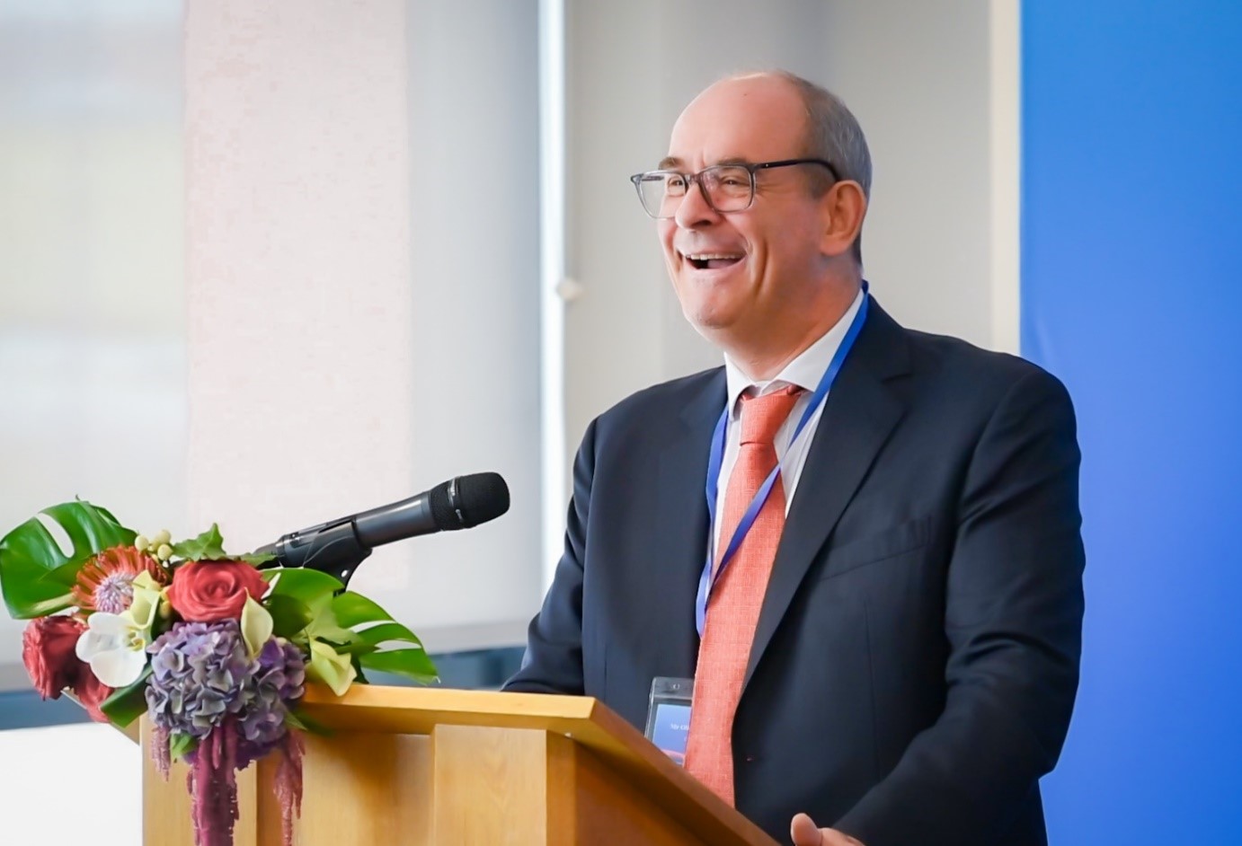 Oliver Treneman, a representative of London Gateway and park development director of DP World London Gateway, gives a speech at the opening ceremony. (Photo/Jinbiao Guo)