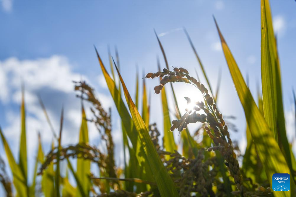 This aerial photo taken on Sept. 12, 2023 shows rice ears at a paddy field in Wanchang Town of Yongji County in Jilin City, northeast China's Jilin Province. Wanchang Town, one of the important rice-producing areas of Jilin Province, is embracing the harvest season of paddy rice of this year. (Xinhua/Zhang Nan)