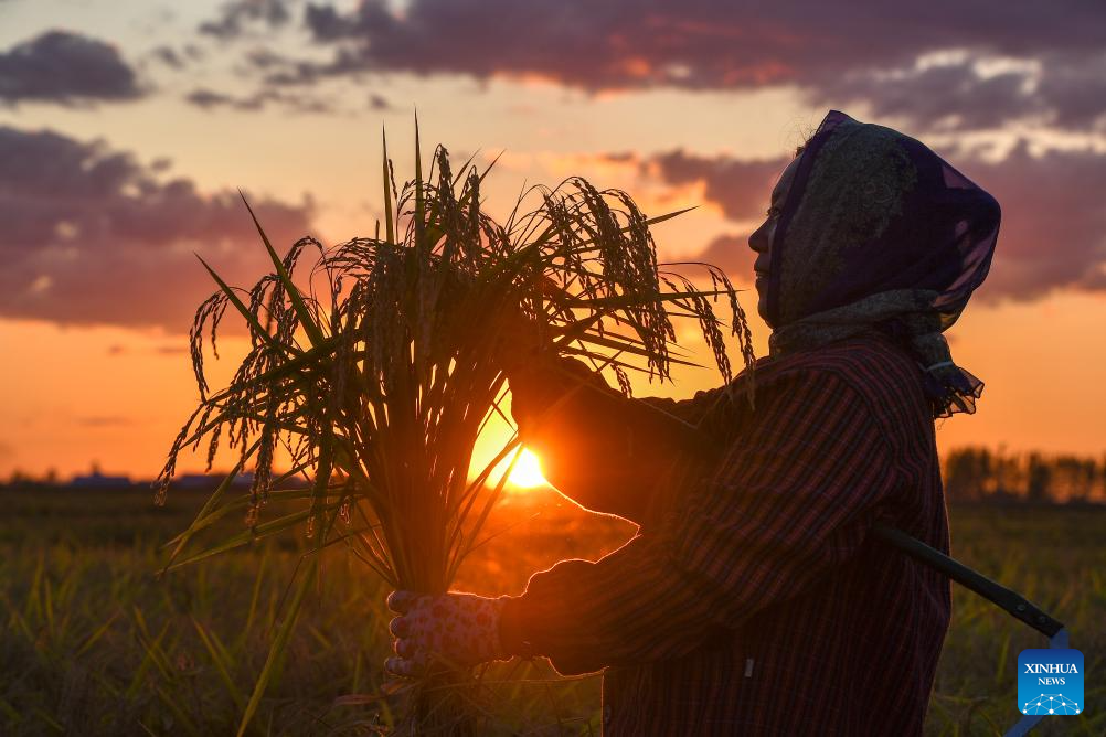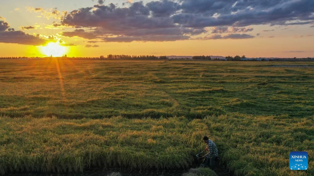 A farmer harvests rice at a paddy field in Huajia Village of Wanchang Town in Jilin City, northeast China's Jilin Province, on Sept. 12, 2023. Wanchang Town, one of the important rice-producing areas of Jilin Province, is embracing the harvest season of paddy rice of this year. (Xinhua/Zhang Nan)