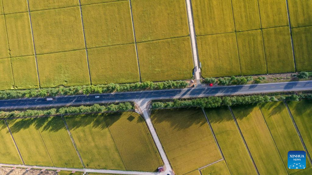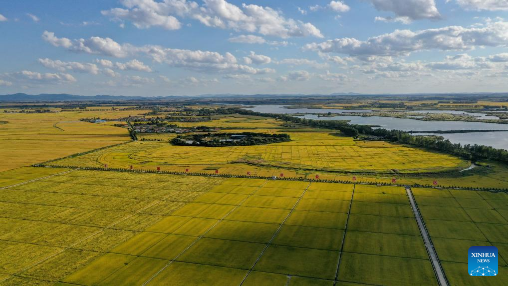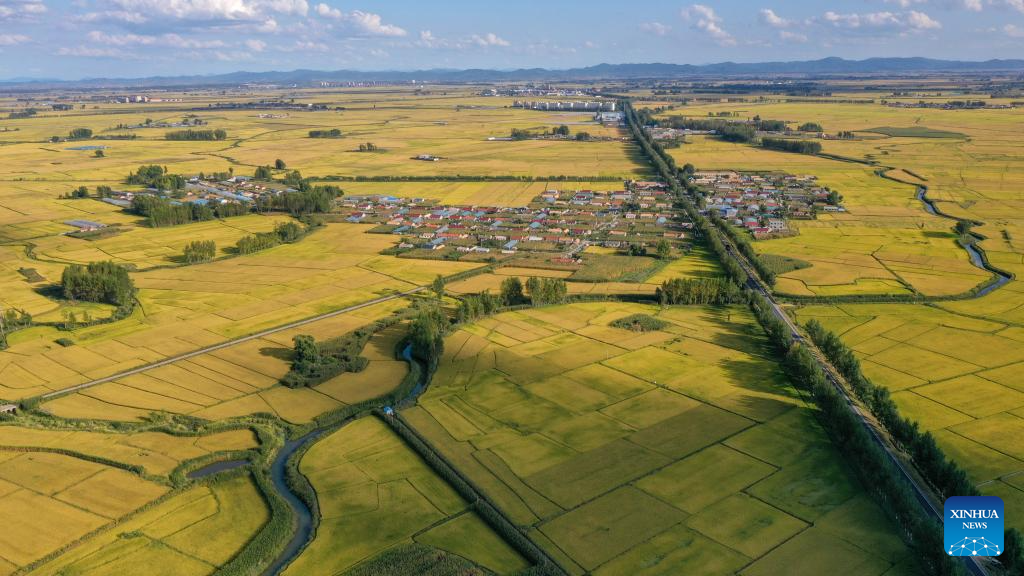 This aerial photo taken on Sept. 12, 2023 shows paddy fields in Wanchang Town of Yongji County in Jilin City, northeast China's Jilin Province. Wanchang Town, one of the important rice-producing areas of Jilin Province, is embracing the harvest season of paddy rice of this year. (Xinhua/Zhang Nan)