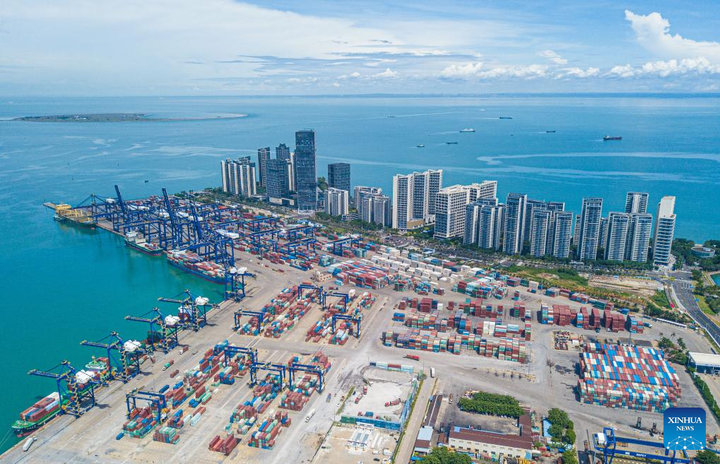 This aerial photo taken on Sept. 12, 2023 shows a view of the container terminal of Haikou Port in Haikou, south China's Hainan Province.?(Xinhua/Pu Xiaoxu)