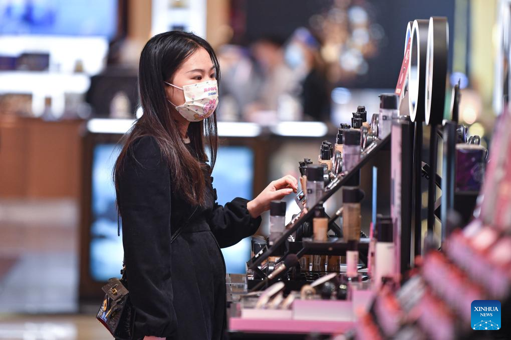 A consumer shops for cosmetics at Haikou Riyue Plaza Duty Free Shop in Haikou, south China's Hainan Province, Jan. 19, 2023.?(Xinhua/Pu Xiaoxu)