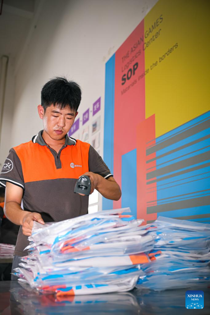 A staff checks the materials out of the warehouse and prepares for delivery at the 19th Asian Games Hangzhou Logistics Center in Hangzhou, east China's Zhejiang Province, Sept. 13, 2023. At present, the 19th Asian Games Hangzhou Logistics Center has entered the peak stage of Asian Games material transportation. Since September, the logistics center of the 19th Asian Games Hangzhou has received and dispatched more than 10,000 pieces of materials per day. (Xinhua/Jiang Han)