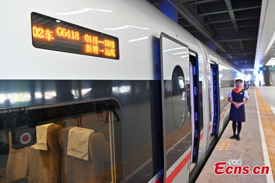The high-speed train G6418 departed from Xintang Railway Station in Guangzhou and arrived at Shanwei Railway Station after about 50 minutes.