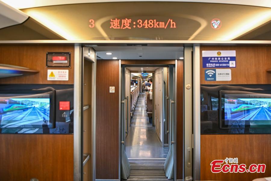 A monitor inside the G6418 high-speed train shows the bullet train attaining a speed of 348km/h, on Sept. 13, 2023. (Photo: China News Service/Chen Jimin)