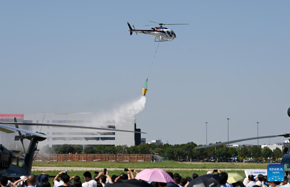 An AC311A helicopter performs during the opening ceremony of the 6th China Helicopter Exposition in north China's Tianjin Municipality, Sept. 14, 2023. (Xinhua/Zhao Zishuo)