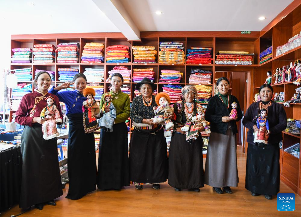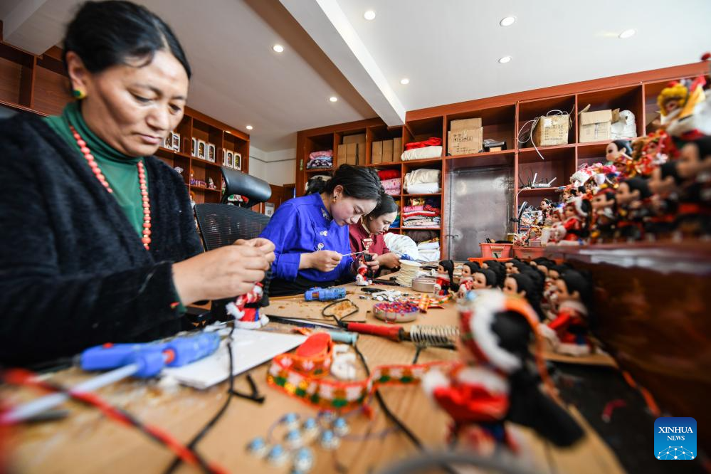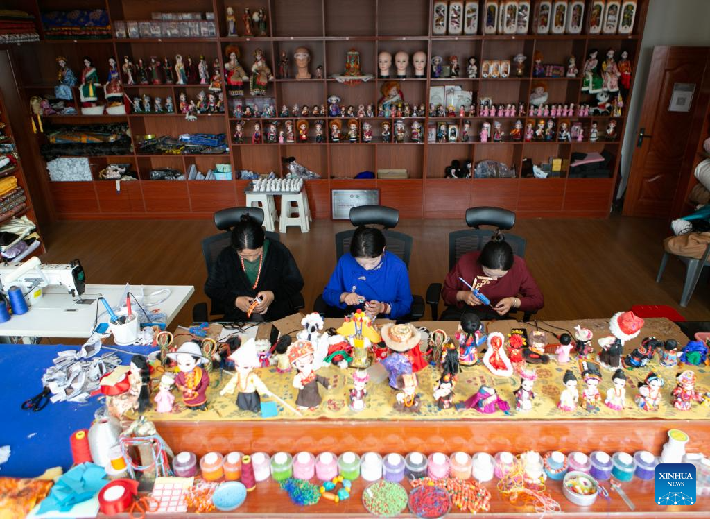 Members of a handicraft cooperative make "Lucky Dolls" in Baihe community of Tangke Town in Ruoergai County, southwest China's Sichuan Province, Aug. 24, 2023. (Xinhua/Wang Xi)