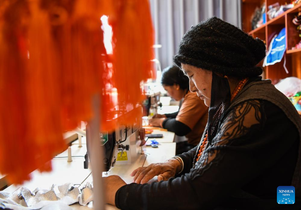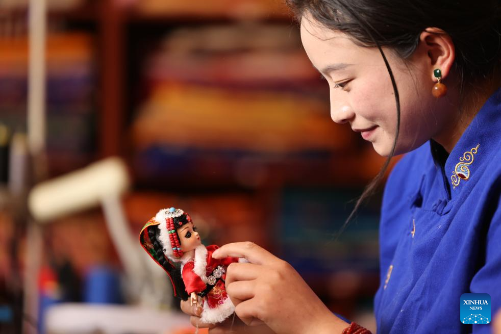 A member of a handicraft cooperative makes a "Lucky Doll" in Baihe community of Tangke Town in Ruoergai County, southwest China's Sichuan Province, Aug. 24, 2023. (Xinhua/Xing Guangli)