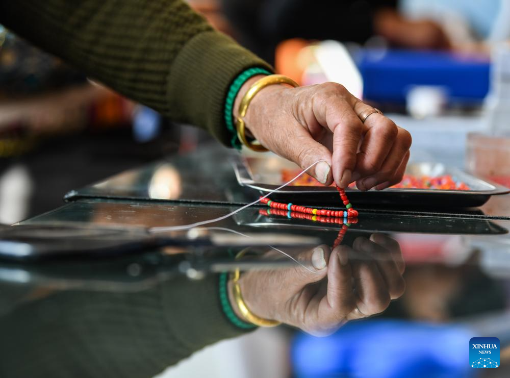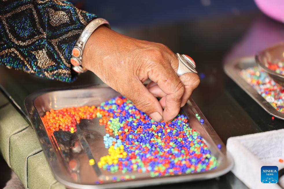 A member of a handicraft cooperative makes accessories for "Lucky Dolls" in Baihe community of Tangke Town in Ruoergai County, southwest China's Sichuan Province, Aug. 24, 2023. (Xinhua/Wang Xi)