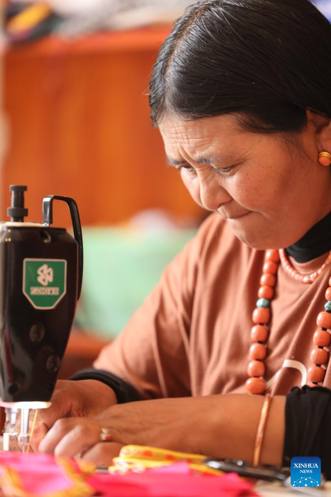 Members of a handicraft cooperative make clothes for "Lucky Dolls" in Baihe community of Tangke Town in Ruoergai County, southwest China's Sichuan Province, Aug. 24, 2023. (Xinhua/Wang Xi)